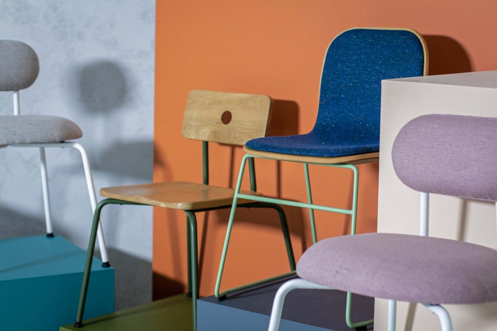 The quirky Moore Chair and Moore Stool, with a single ‘eye’ placed on one side of the backrest, take their name from Patrick Moore, the eccentric monocle-wearing English astronomer. Made from formed beech ply and a steel wire frame (and available in oak veneer or upholstered versions), the characterful Moore Chair and Stool are ideal for use in coffee shops, cafes and restaurants. Also perfectly suited to a range of hospitality settings, the Delores Chair and Delores Stool each have a lozenge-shaped, padded backrest and seat, set on a tubular steel frame. The smart, modern dining chair and bar chair/stool offer great design versatility: upholstery is available in a variety of fabrics and leathers, and the tubular steel frame can be specified in any colour choice.
