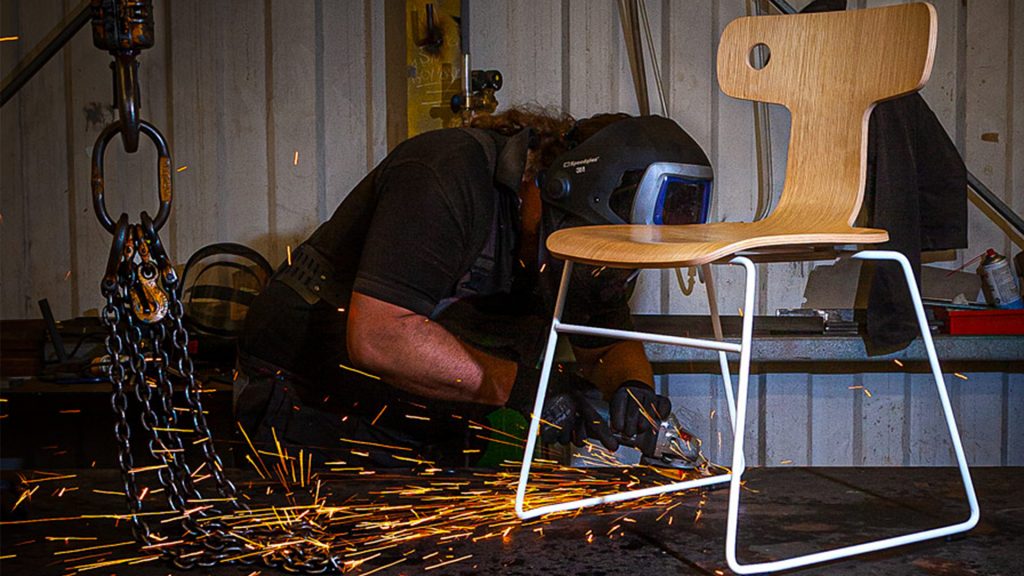 The curved plywood part of the chair is made at a sawmill in the heart of a European FSC forest, where trees go in one end and the formed plywood seat comes out the other, making it a very efficient and sustainable process. The bespoke steel wire frames are made here in Britain where we put the components together by hand. The seat is the only part which is not made in the UK as it was more sustainable to source from the forest itself rather than in the UK.