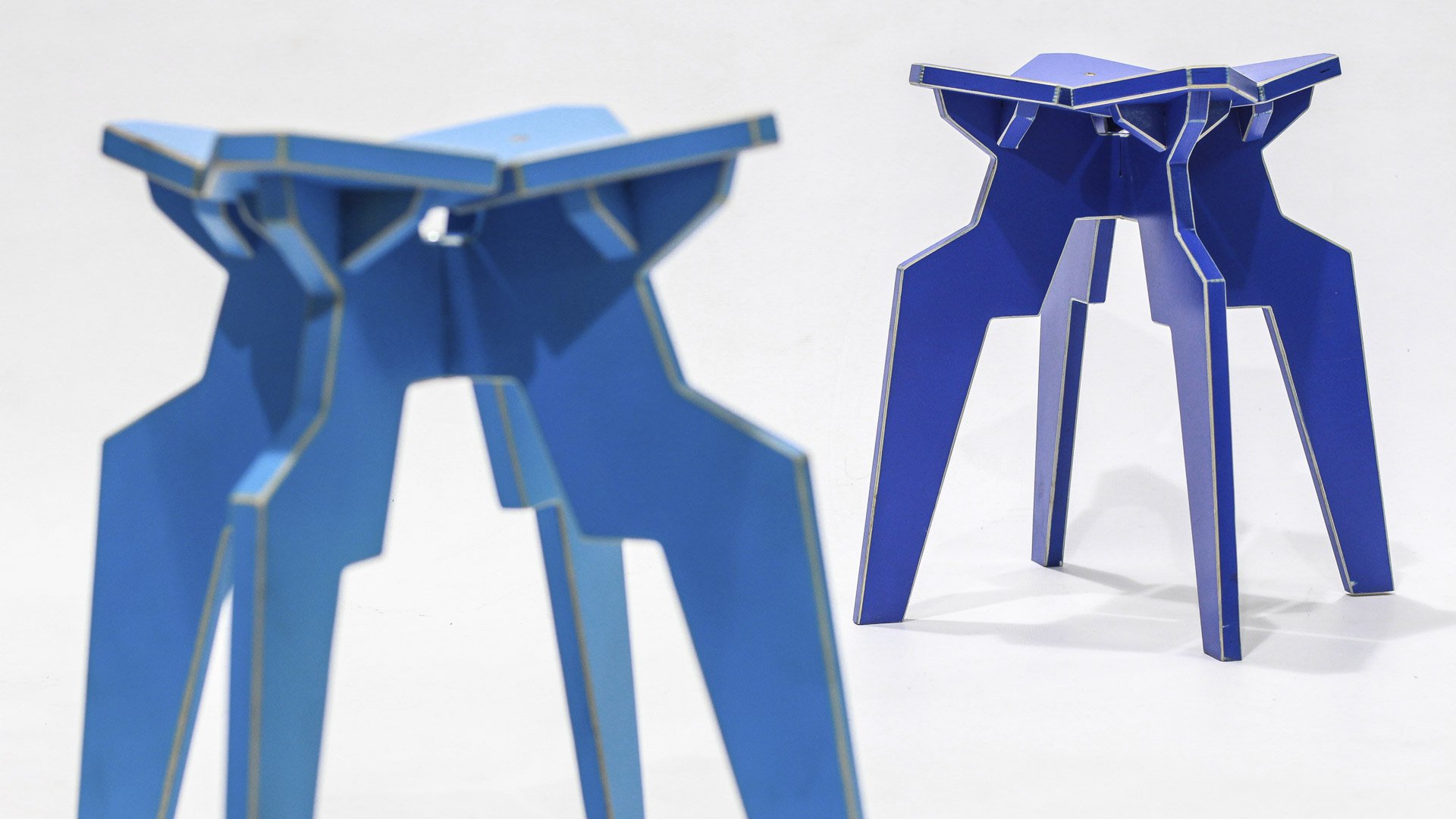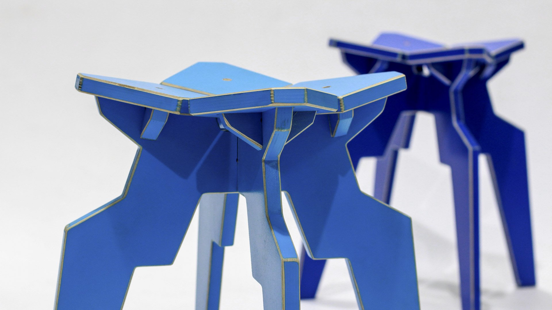 These are the stacking stools of the Splice range. Shorter than the bar stools, they stack neatly on top of each other and make practical but funky cafe furniture or breakout area furniture. Inspired by the maritime surroundings of our original studio/workshop at Shoreham Port this original designer furniture uses similar angular shapes to those seen in such things as dockside machinery and sea-defences. The strong forms of the stools are picked out by rubbing back the paint on the edges before finishing in a clear lacquer. Clients can choose a bespoke colour to suit their commercial interior design.