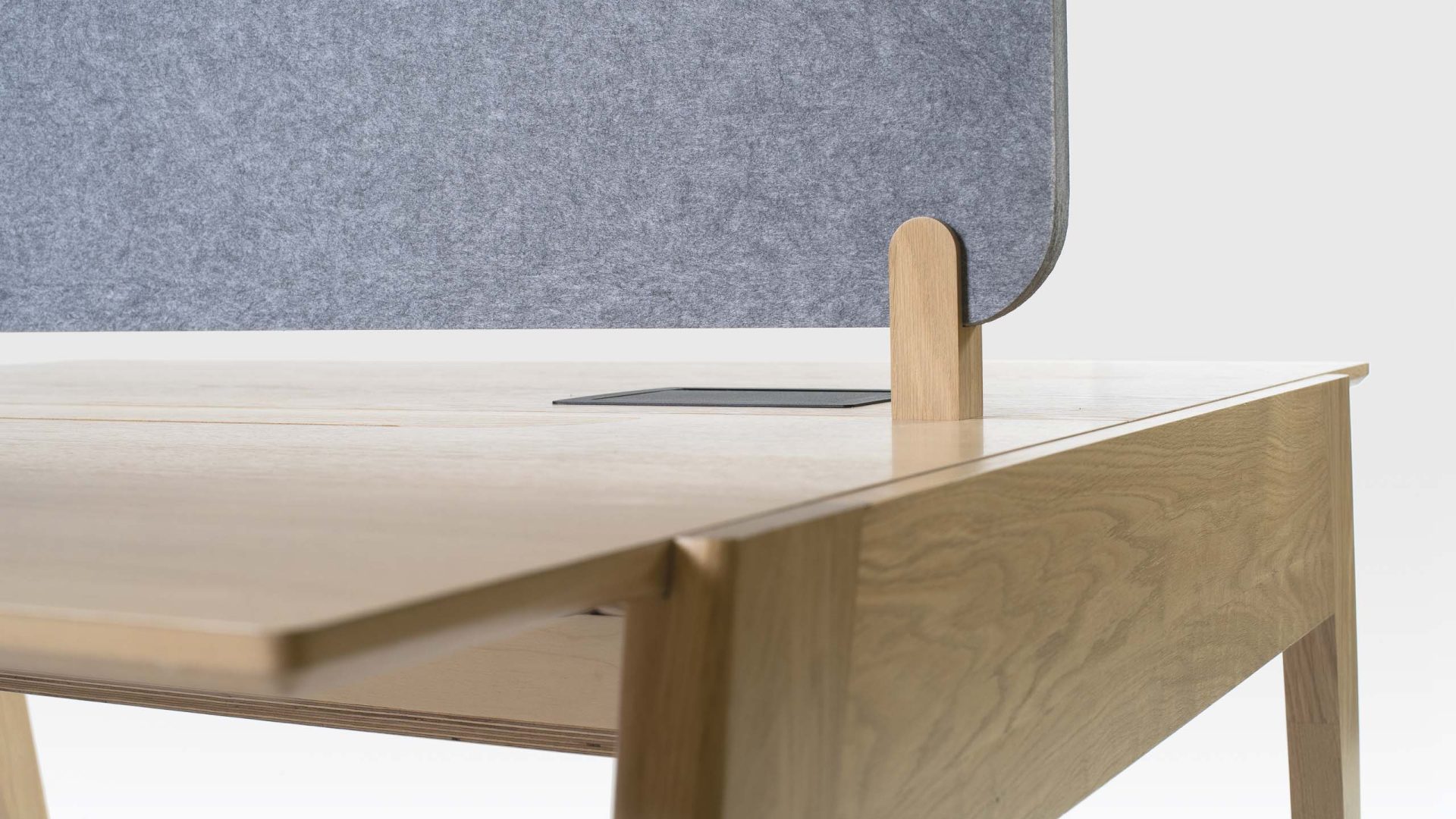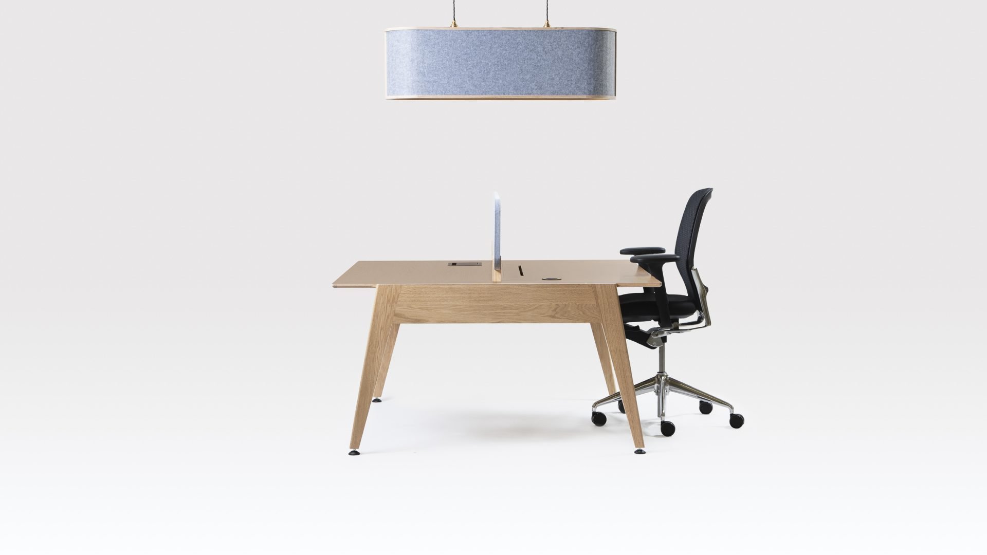 As with the other pieces in the Theodore office furniture collection, the Edge office desk is made in Britain by our own craftspeople. Using sustainably sourced FSC timber, the distinctive legs and frame of the desk are constructed from solid oak and the top is made of oak-veneered birch ply. The oak desk also has an optional top divider in the form of an upholstered acoustic screen that can be specified in a choice of fabrics. A unified look can be achieved throughout an office interior by having a mix of the various desks in the Theodore range because they all use the same design language of angular shapes.