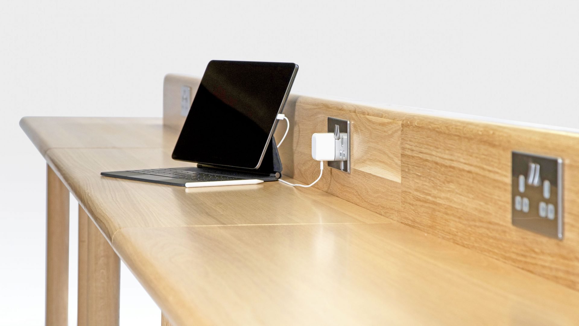 The Jasper Long Table is an adaptable piece of modular furniture that can be extended from two sections upwards to suit your requirements. The wooden table is handmade to order in sustainably sourced oak by our own craftsmen in Sussex. With heavy dowel legs, deep frame, and robust top, the solid wood table is very durable – making it ideal for commercial use such as for offices and hospitality settings. The long table also comes with a built-in central power supply unit in the form of a raised wooden panel that houses sockets for laptops and phones.
