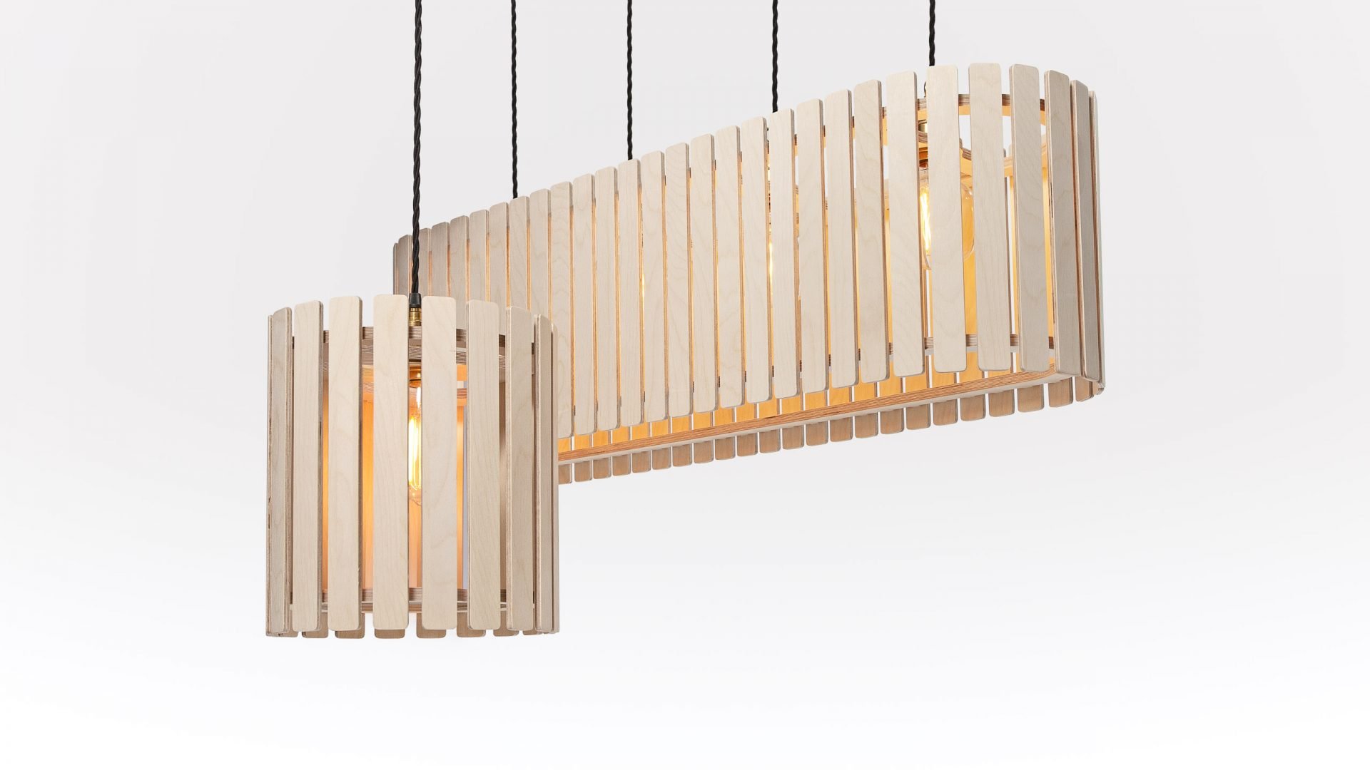 The Brixham Long Wooden Ceiling Light takes four bulbs set within its wide lampshade. It’s one of a range of wooden lights that come in several styles of varying sizes. The design of the large lamp shades take their inspiration from traditional crab pots made of wooden slats. Which is why the lighting range is called Brixham, after the Devon fishing town. This hand-finished wood light unit makes a distinctive solution where long lighting is needed in a modern commercial setting, being available in several finishes including an oak veneer, as well as bespoke colours to suit your interior. The Brixham long wood pendant light is designed and manufactured by Liqui Contracts in Britain and is made of sustainably sourced birch ply.