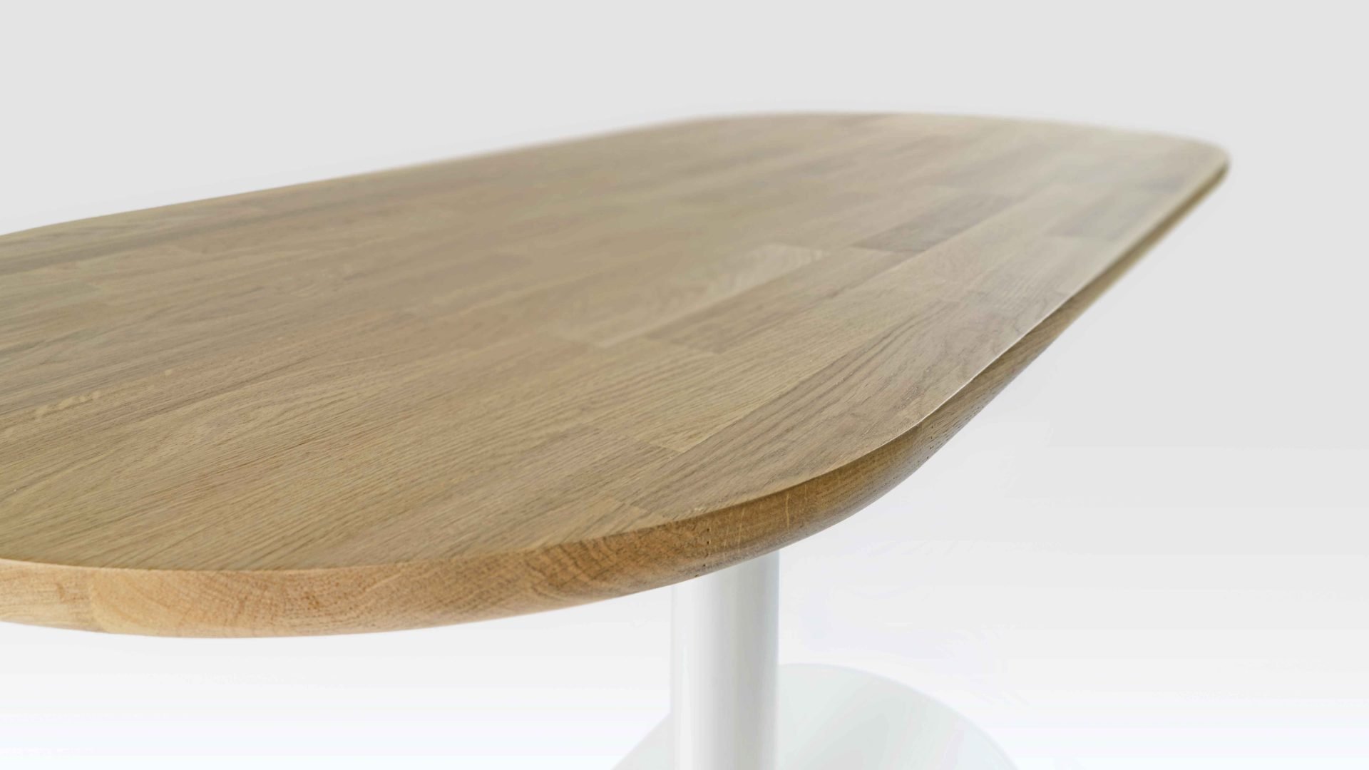 The Georgie pedestal dining table has a distinctive lozenge shaped top in solid oak. The same contour is followed through in the profile of the powder-coated steel base; making this 4 seater table a stylish, as well as durable option for a variety of hospitality settings. Especially as this contemporary dining table can also be used in conjunction with the other modern tables in our Georgie range which are similar in design and available in an assortment of sizes for different uses: Styles: Georgie Side Table / Georgie Cafe Table / Georgie Coffee Table / Georgie Poseur Table.