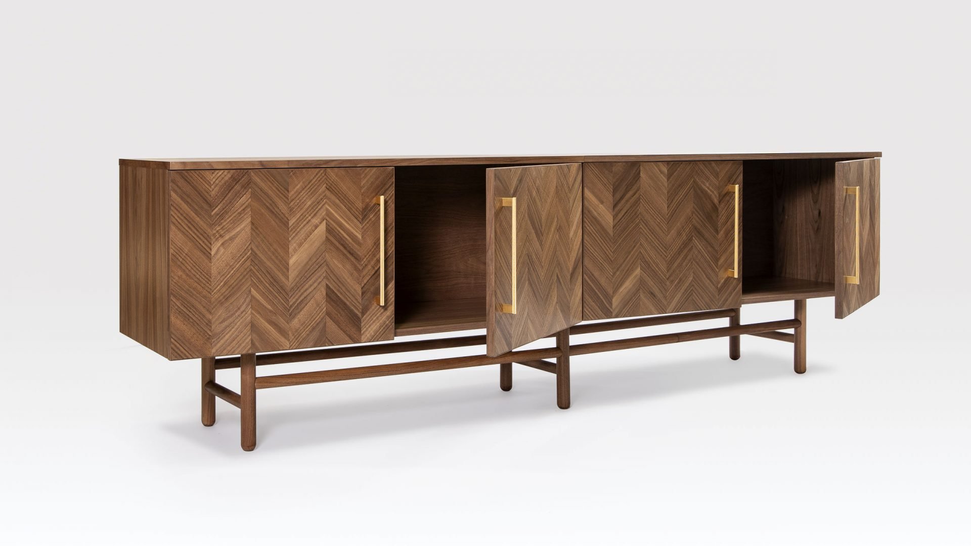 The Cyril sideboard 2400mm is an extra large sideboard that can be used in place of filing cabinets when a more domestic look is required for your office furniture. That’s because they have been designed to hold lever-arch folders as well as being useful as general storage cabinets. This extra long sideboard is part of a versatile range of modern office furniture that has been influenced by mid-century design. Handmade to order by our craftsmen this wooden sideboard has a carcass made of sustainably sourced birch ply, while the legs and stretchers are solid turned walnut. We offer a choice of door options that not only includes a herringbone-patterned walnut veneer but also an acoustic version. The Cyril extra large sideboard can also be made in bespoke sizes to fit your commercial interior, making these sideboards very adaptable, as well as great to look at.