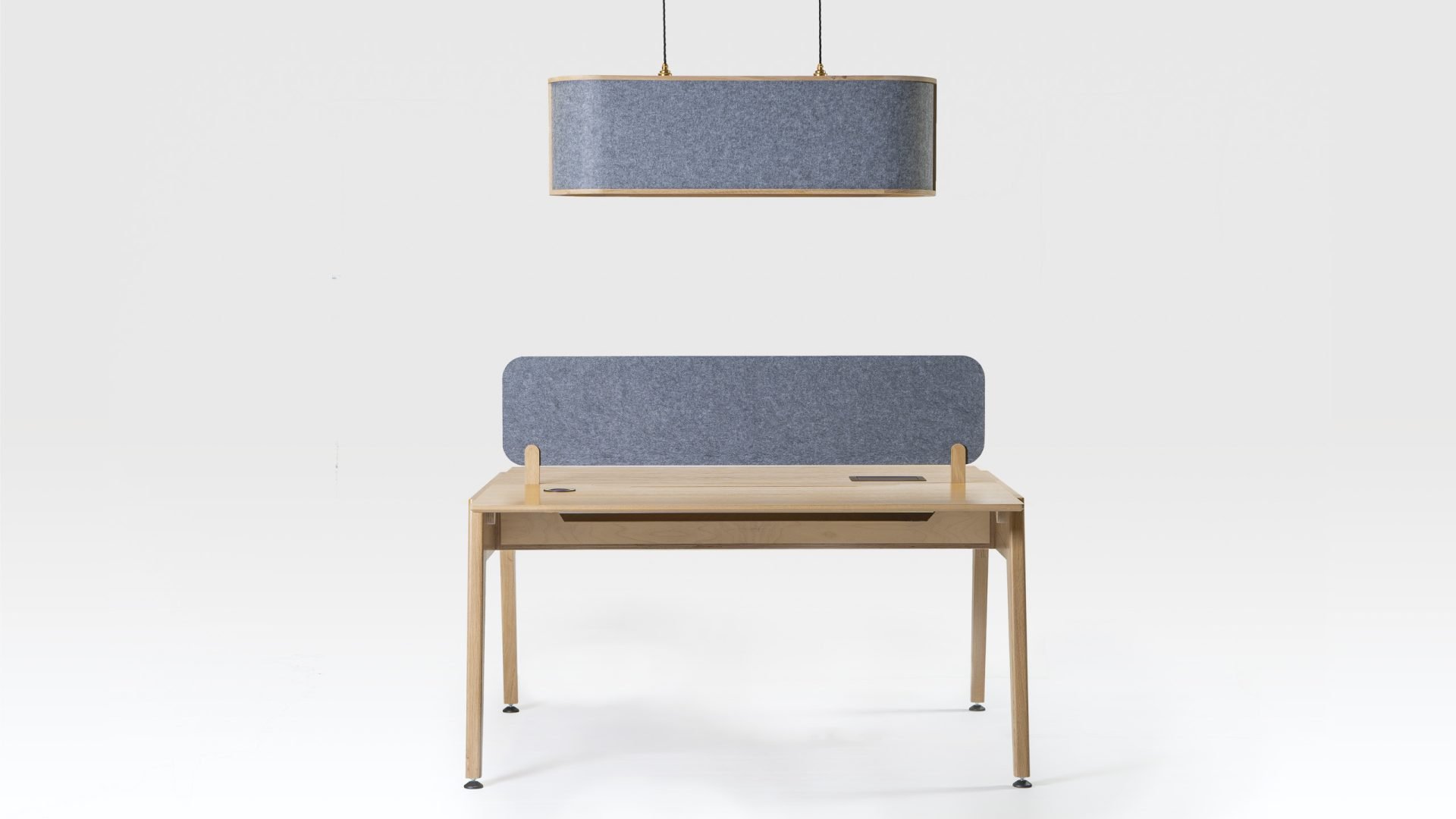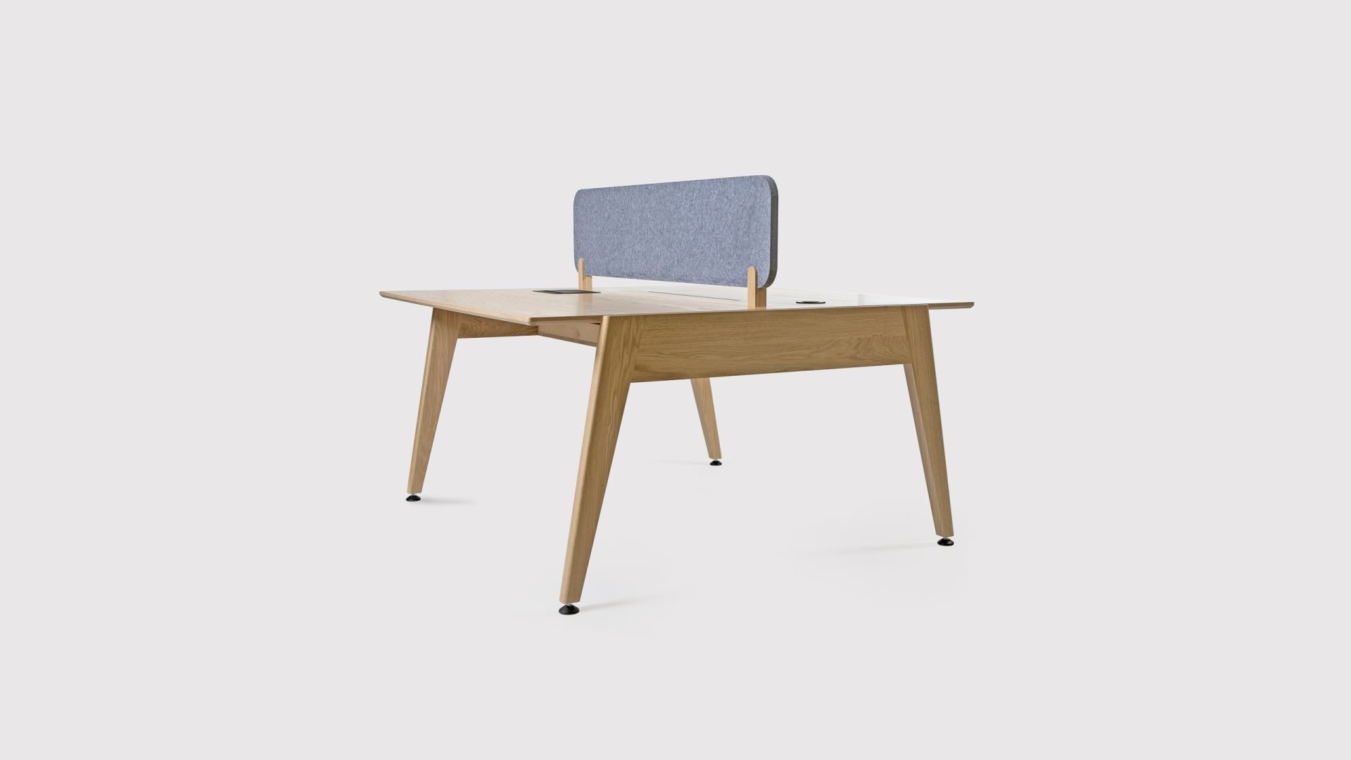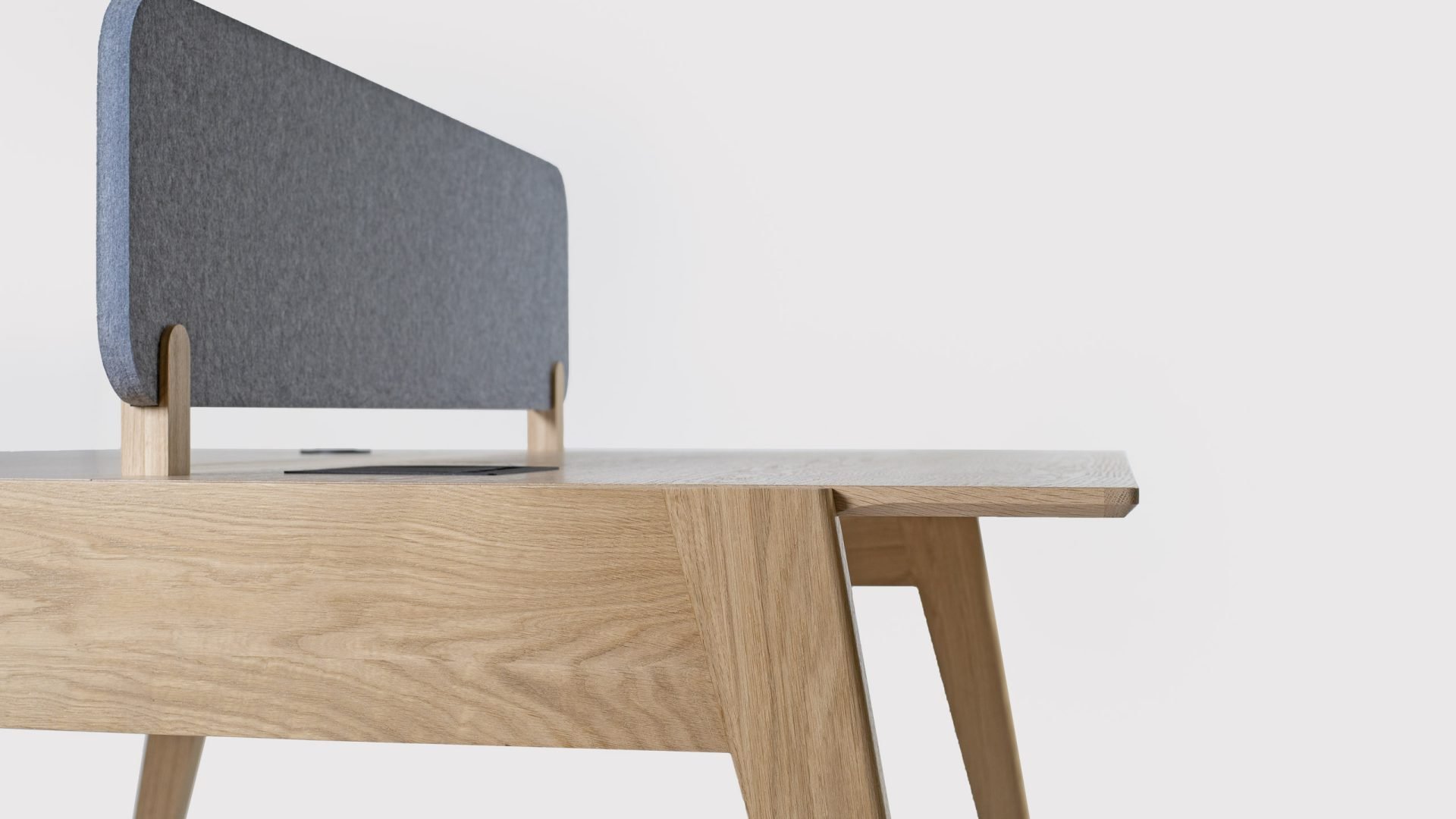 As with the other pieces in the Theodore office furniture collection, the Edge office desk is made in Britain by our own craftspeople. Using sustainably sourced FSC timber, the distinctive legs and frame of the desk are constructed from solid oak and the top is made of oak-veneered birch ply. The oak desk also has an optional top divider in the form of an upholstered acoustic screen that can be specified in a choice of fabrics. A unified look can be achieved throughout an office interior by having a mix of the various desks in the Theodore range because they all use the same design language of angular shapes.
