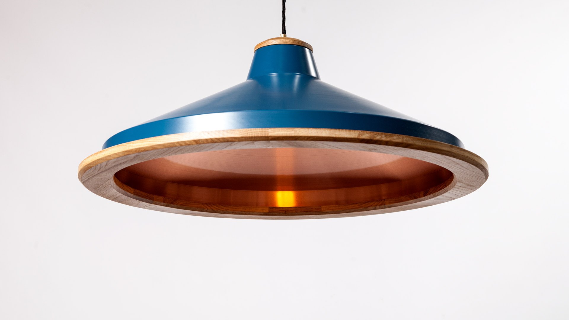 The Trafford is a large pendant lighting option which retains the essence of a traditional pendant light fitting while still being wholly contemporary. With a choice of Birch ply or Oak trimmed rim and top, the spun aluminium shade can either be finished with a clear lacquer or powder coated if preferred. And if your commercial interior would benefit from copper ceiling lights this is a bespoke alternative that we offer.
